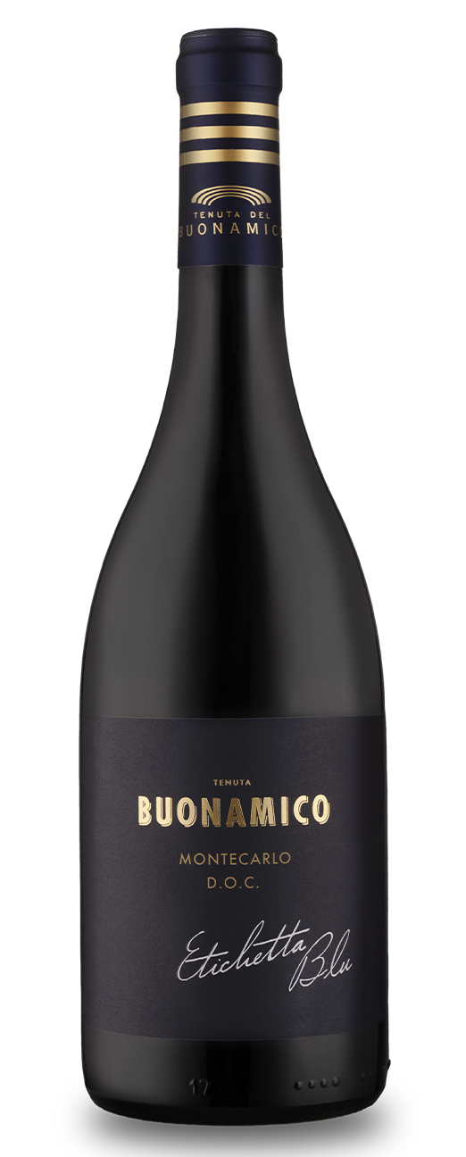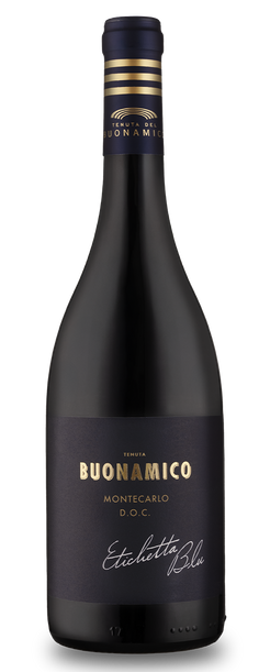Sempre alla ricerca di qualcosa in più da offrire ai loro clienti, la famiglia Fontana, i proprietari della Tenuta del Buonamico, ha deciso di proporre un vino che, pur mantenendo le caratteristiche della tradizione di Montecarlo, potesse essere un ottimo compromesso tra un vino di facile beva e una riserva importante. Così, qualche anno fa, è nata L'Etichetta Blu, che coniuga tradizione e innovazione allo stesso tempo. Come il disciplinare di Montecarlo prevede, infatti, si tratta di un blend di Sangiovese e uve francesi, ma l'espediente geniale per conferire un “che” in più a questo vino è stato quello di invecchiare il Sangiovese in Barriques di rovere francese per sette mesi. Questo vino ha un caratteristico profumo netto, con note intense di frutta ross, fiori, cacao, vaniglia e spezie. Al palato si presenta ampio, denso e vellutato, con una trama tannica evidente ma piacevolmente arrotondata, equilibrato e persistente. E' perfetto in ogni occasione, e in particolare per una cena in famiglia a base di carne.